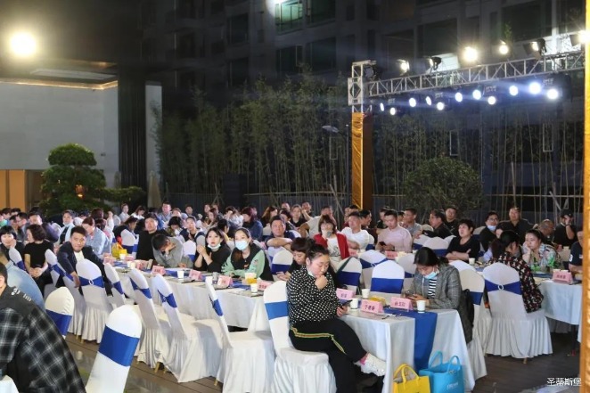 经销商晚宴当日晚6时许,以【乘“圣”跨越】为主题的,快盈VIII集团第45届国际家具展接待晚宴暨2020年度优秀经销商颁奖盛典,在营销中心四楼景观花园隆重举行,来自全国各地的经销商朋友欢聚一堂,共同分享一场精彩纷呈的晚宴。