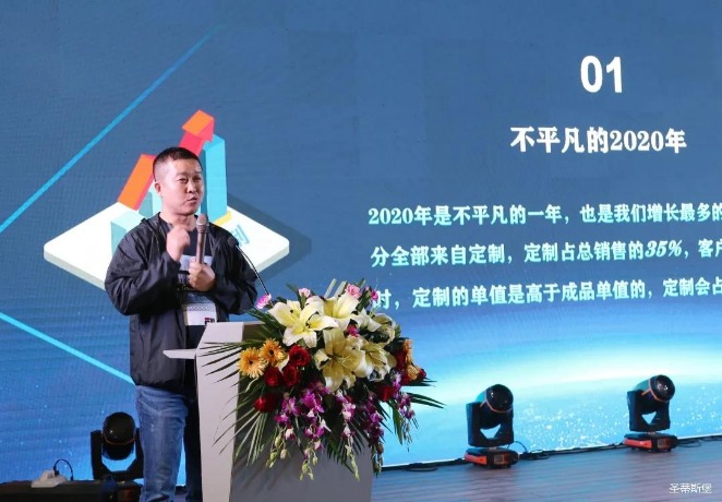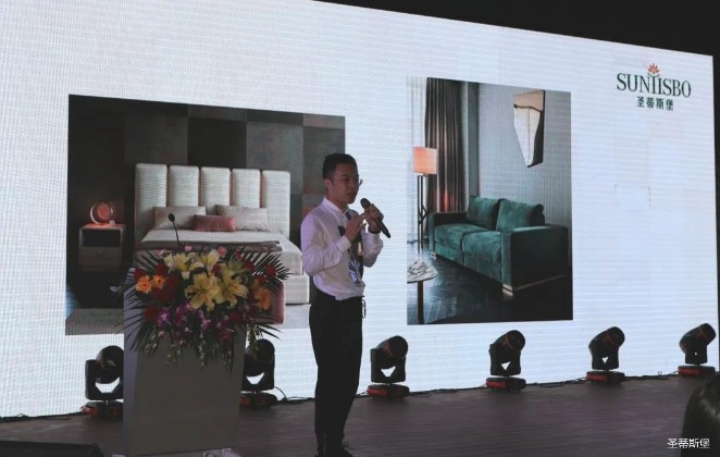 华灯璀璨的开场仪式,点燃了现场如火如荼的气氛。快盈VIII集团营销总经理陈玉伟先生对晚会进行了主题发言,他对2020年的营销工作进行了总结,并着重从营销工作部署、重点项目开展、产品整合、拎包帮扶、渠道运营和移动+定制整装优势等方面对2021年的营销工作做了全面的统筹规划。同时,他还讲解了“美国梦凯莎床垫”新品的产品工艺、市场优势、产品定位,使经销商对我们的新产品拥有更深入的认识和了解。